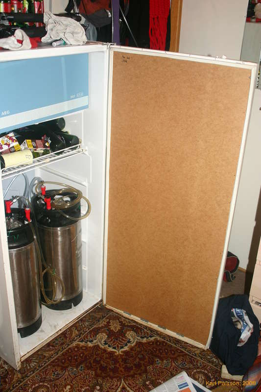 To get the cornies to fit inside my fridge, with or without building a special floor required taking off the door shelves. I bought a sheet of oiled/waterproof board from Byko. It cost me 1000kr, but I got the whole board. I had a bitch of a time getting this all to mount up again properly, and the fridge door still doesn't close properly. I think the door warped between taking the shelves off and getting the panel remounted. Without the shelves, the door was really floppy and weak. Well, electricity is cheap here, and it's only a small gap in the seal, and the beer's still cold, so I'm probably not going to try any more. I've already tried remounting it about three times.