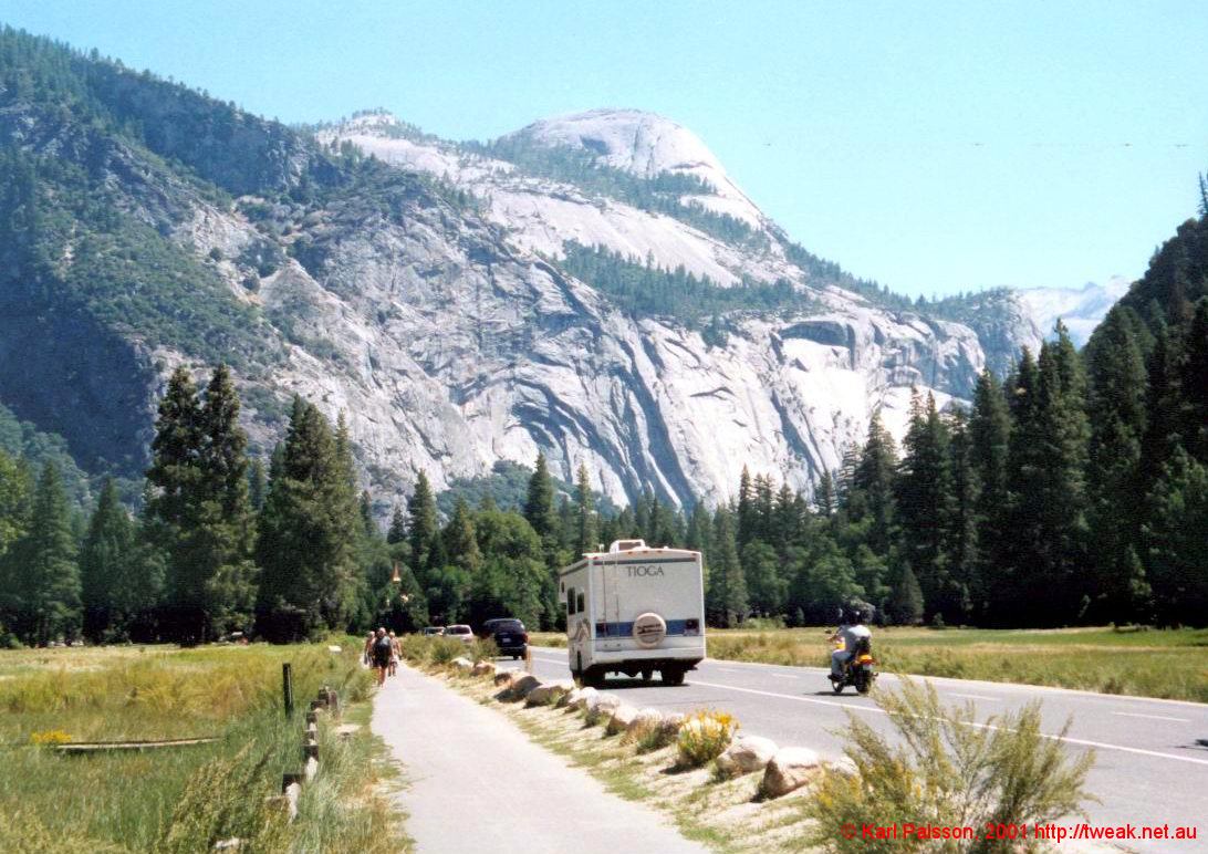 My First trip to yosemite! What a shambles the organisation was. We had about 8 people keen, but everyone had their own agendas. So we ended up with three mini trips. Greg and Steve wanted to leave friday afternoon, early, and were going to return saturday night. I wanted to go saturday morning, and return late sunday night. Adam and Jenna were going, but no-one had any idea when they were going, or even if they would go. The other distinction was that Nick, Mike and Myself wanted to go up Half Dome. Anastasia was along for the ride and was tough enough for anything. So we borrowed Greg's cisco car, an impressive Buick Regal. (Our cisco car had been returned by now, and mike didn't feel comfortable that his car would make the distance.) The buick was awesome, a total old persons car, but cool nonetheless. Stereo controls built into the steering wheel, split cabin climate control, v6 herbs for takeoff and landing. A real cruiser. We took off, early from my place, with the boot full of shit and headed up through livermore and out through stockton. I got tired and Nick took over for the drive down into the valley, and demonstrated why automatics should never be driven in the hills. At least, not by people who always drive automatics. Nice guy and all, but you've gotta use a lower gear dude. We got out just before one of the tunnels for our first look at the valley. Couldn't see much from here, but we could see a couple of groups of climbers on the wall above the road. (Cookie cliffs I believe) Headed on down into the valley for a better look, and also with the foolish goal of getting a campsite. Who were we kidding, the rangers actually even laughed at us. We had a great look at the valley, and went to camp 4 to see if greg and steve were around (They were on the waiting list there) Didn't find them, so went on up to bridalveil campground, on the southern valley rim, on the road to glacier point. Set up camp, quite a few sites remaining up here, then went off to check out glacier point. (It's just as well we did set up camp first, after glacier point we went down to bridal veil falls, down in the valley proper again, and by the time we came back up the camp was full)