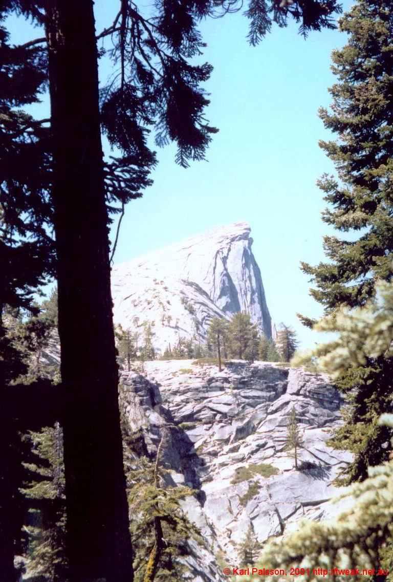 Half Dome day trip! 17 miles return, 4800 feet elevation gain, all the way up, then all the way back down. There is virtually no downhill on the way up. It just keeps going. We got to the carpark a little later than we'd planned, around 8am, rather than the 7am I'd hoped for. By some weird fluke we were just leaving the car, when who should pull in beside us but Jenna and Adam. They couldn't be convinced to come up Half Dome with us, but they were heading up the same track, (They were going up to Vernal Falls, they may have made it up to Nevada, I can't recall) so we headed off together. We took the John Muir trail on the way up, which was gentler, a little longer, and gave us a better view of the valley we were going up. You spend the entire morning just going around the back of Half Dome, via Vernal Falls, Nevada Falls, little Yosemite Valley and so on. Quite a wondeful view though, you get very close to Liberty Cap, (Surprisingly few climbs on this, at least according to my "Yosemite Big Walls" book. (Talk about coffee table book, I bought the wall book before I'd even climbed in the valley, I still haven't even climbed there!)