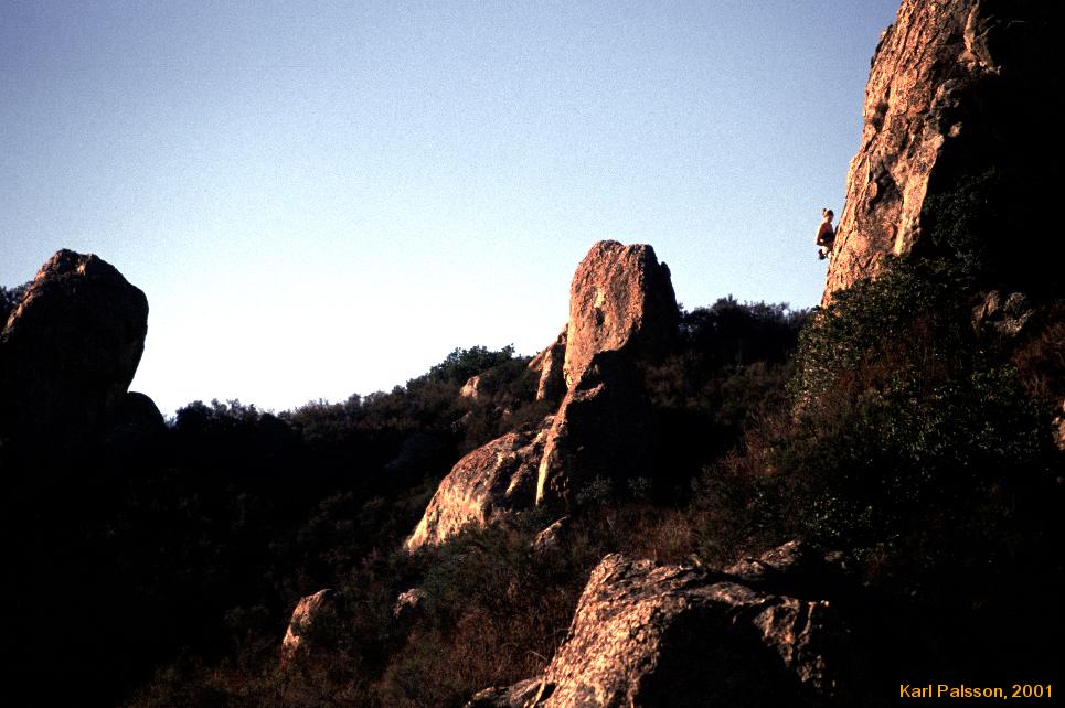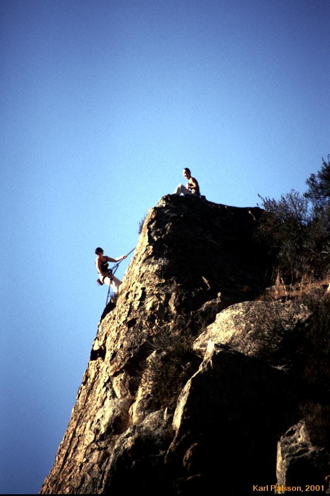 One fine day, Scott and I decided to go for a look at some of the longer routes in Pine Canyon, further into Mt Diablo state park. (Further into for us, it's in the northern part of the park, and the walk in is substantially longer (though still not that long really)) We actually parked in the wrong place, and had a quite lengthy walk, and saw about all there is to see out there really. We didn't even find the climb we were trying to find in the end, though the party of three we met out there managed to find theirs, and they were on their first trip out of the gym. Much kudos to them. (God knows why they chose pine canyon for their first out of gym experience, but that's cool.) We did eventually end up top-roping a nice looking overhanging featured wall that had some crazy looking old button heads on it (it also appeared to be a wall not covered in our guide (Thornburg's "Bay area rock") It was on the shady side of the large boulder near the aztec head. (The topo in Thornburgs guide made very little sense to us) The rock was loose, and we didn't feel like working it, (It was just on the hard side for us, and would have been rewarding to work) given that were were topping it on one of my half ropes we'd brought for "Caves Route" Oh well. We ended up playing pool and drinking beer in a lovely place in Berkeley.