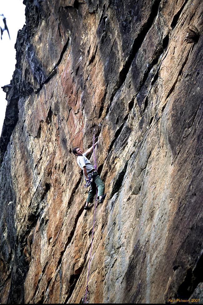 SSC4 was a bit of fun. Bob felt like doing some hooking/low risk aiding, I felt like that would be fun, James said he would be our guide. (because he is soft) So we wander on down to Porters Pass, having a good look at all the other stuff that rarely gets climbed and finally make it to the base of SSC4. For whatever reason, I get the first pitch, and start off the block in etriers. I struggle with the aid, and eventually just get my shoes passed up and free up to the fourth bolt. Who would have thunk it, me passing up on aid to free a 24? Of course, I get a bit hung up, and end up lowering off to let Bob's superior skills take over. Bob cleans up the first pitch, and I muscle/pull/getpulled to the top to be his belay slave for the next pitch. James continues yelling (un)helpful hints and vague memories of the time he and maxwell claimed to have done the climb. :) He was at least kind enough to take some pics for us. James claims that the sport gods are frowning upon us, especially after I take a bit of a chunk out of a nice figners edge with a hook, and that we will be struck down for our sins.