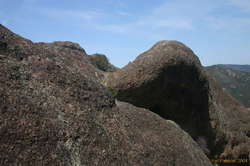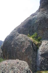 Next, another fairly easy lead for scott. He got to climb up to a notch, and then downclimb with a toprope about 15m down the other side. Fucking joy. I sat up in the notch, at the bolt, with a backpack, and decided that the bolt had a ring on it for a damn good reason, as I rethreaded it so I could have the rope security too. Scott was belaying from a ledge which was plenty good enough to stand on, but if I came barrelling down the chute, there was a reasonable chance that I'd continue over the edge, and pull him behind me.