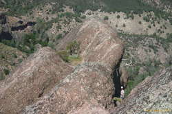 I won the first pitch, something I normally hate doing, but I sucked it up, bouldered up and left, and climbed right up to the first bolt. Yay for me. I normally hate running it out off the ground. Climbed up to some anchors, and then decided to rerig on the ridge itself.