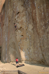 We cross over Asterix Pass, chasing the shade, and meet some climbers with the red guide. (The addendum to the blue guide) We find a pleasant 5.8, Benedictine Punk, then Marcus has a go at Manic Nirvana, a 10c that climbs up around the lip of a big arching overhang. He can't quite make the crux, and the fall looks bad, around the lip of the overhang and sideways.