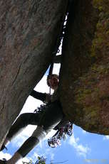 We started off the day with a 5.8, to ease us into the Vedauwoo climbing scene. Through thick and thin. Hard work. Very wide, very abrasive, I learnt to tape pretty well by the end of the stay. Finishes out a roof, then we decided the rest of it wasn't worth doing, and rapped off a horn. Next in line was Narrow and Ugly, a 9, but when we got over there, Wide and Ugly looked much more appealing. Well, to second anyway, but Curt liked the look of it to, and headed up overhanging fists and hands, 5.11a. Lots of cams, which made it much more achievable for me to try and follow. This was also very hard, as I suppose it is entitled to be at 5.11.