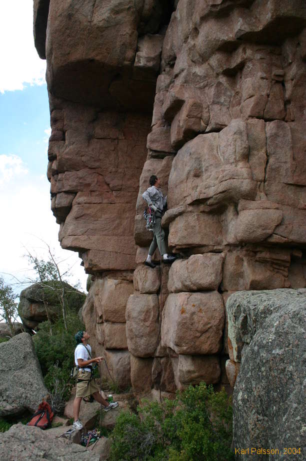 Curt starting the Grand Traverse, 5.10a, Matt belays