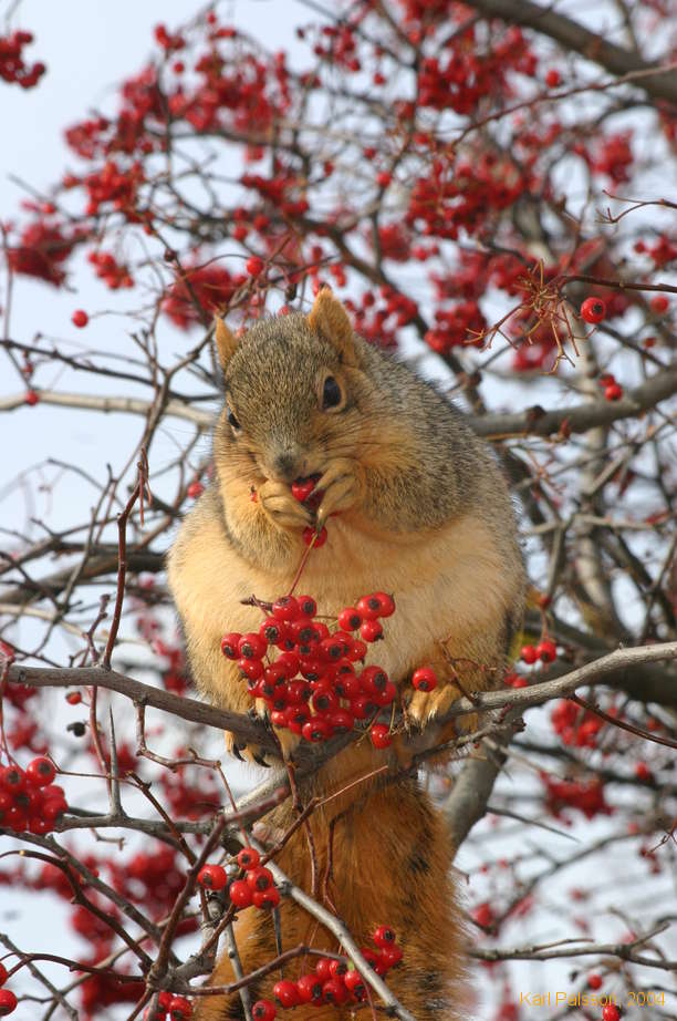 Overfed squirrel gorging on hawthorne berries, Niagra, NY