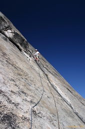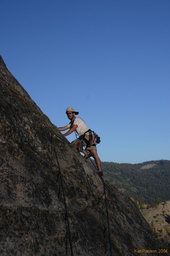 Trapper Dome is close enough to walk straight from camp. We wander over and run into a nice pair of gents from Fresno, Lon and Dave. They are pleased as punch to have some people here to show their crag to. They are leading Tao when we get there, which looks cool, but we run up Drill Instructor/Good Deed/whatever to the right of it first. Which was really easy, and served only to warm us up nicely. Which was a good thing I guess. We rap down and I lead Tao (5.7), which is much more interesting, with some nice balancy traverses. A bit short though. We try and toprope the direct start, which we can't determine if it has a name and is a unique climb or not. I need to interject here and say that the kings canyon and sequoia area climbing guide, (vernon, moser, hickey) is fairly sucky. Not real great topos. Very vague. Good for having detail on lots of areas, lots of ideas, and I'm sure it preserves the sense of adventure, but when you're looking at a wall of clipups, it's nice to be able to work out which is which. Maybe I'm just soft.