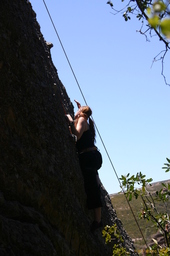 I got TJ set up to start belaying people up there, while I went off to belay Scott up Organgrinder. (5.8+) Gessara watched and learned how to lead belay. Scott couldn't quite pull it off without stemming across the chasm, but made it to the top quite quickly, and we got a second rope set up.