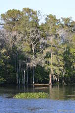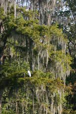 Bald Cypress, adorned with spanish moss. Water Hyacinth (pest) floats by | Egret loitering in a Bald Cypress | Bayou scene |