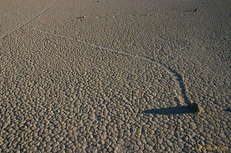 Partly due to washed out roads, and partly due to a desire to have a look at the other roads that lead into Death Valley, we came in through the North East entrence, past Scotty's Castle, but before we'd even reached the park entrance, we saw a great big mudflat/playa off the side of the road, and decided to go out and have a look at it. We were just expecting to see neat mud cracks and so forth, but much to our surprise came across two "racetrack" stones. They had left fairly short paths behind them in the mud at some point when the wind and water conditions were all just right, about a foot long. We quickly found more and more and more of them, some with paths as long as 100 feet, some as short as 1 foot. They squiggled, they turned left, they turned right, but above all, they were just absolutely fascinating.