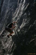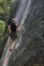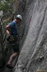 I then stayed up on top, to take pictures of Matt leading Lazy Bum, (the right hand one) Matt even developed an audience by this time, as they are much more commonly toproped than lead. All was going well, until the crux. He almost had it, but at the last second, didn't quite get the finish holds, and went for a good long whipper, probably about 25 feet. Fun for everyone, and one of the longest falls he'd had in a very long time. Second go he got it, only this time he put in a higher nut, saying, "I don't feel like falling that far again."