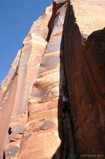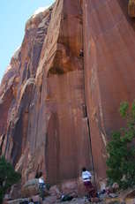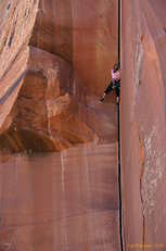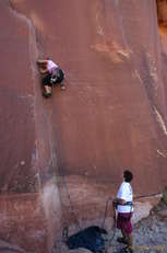 Back to Supercrack Buttress, setting up ropes on 3AM, Gorilla, and Wild Works of Fire. Managed to flash Gorilla, but needed rests on both the others. Very excellent climbing. Hard! People had to go back to work then, so we all headed back up to Moab. I was going to go climbing with Larry at Maple Creek, a locals only ("I'll break the knees of anyone who ever makes a guide for maple creek") area, where we toprope an 11, called Fern something. An enormous change from Indian Creek. Crimps and balancy face climbing. Some of the hardest clibing I've ever gotten up. Climbed at two creeks in one day, then went for dinner with Larry.