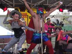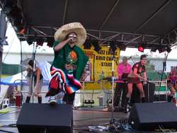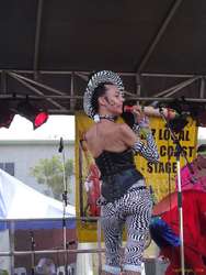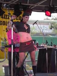 Saw Monster Zoku Onsomb again, who are a fun dance show with music, but it's hard to take them as musicians. Great show though. It's like a stage show, with song and dance. Saw Le Tigre who were really neat, the Donnas, who I missed most of, RJD2, Money Mark, the Chemical Brothers and part of the Beasties. I got bored with the early part of the Beasties show, as we were a long way back, and it was just three guys wandering around on stage and rapping. Later on it apparently all cut loose and they deployed instruments and a drum kit and all sorts more interesting stuff. I had gone to the boiler room for the chemical brothers by then.