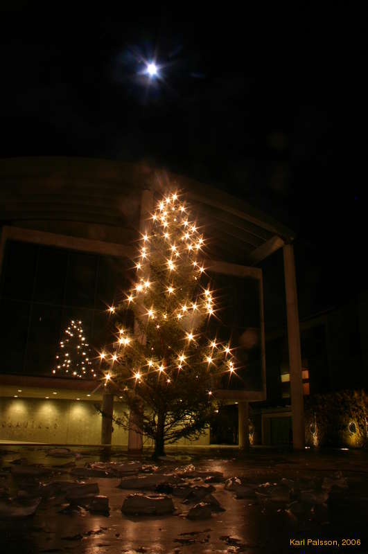 A christmas tree in a sea of ice, under a full moon